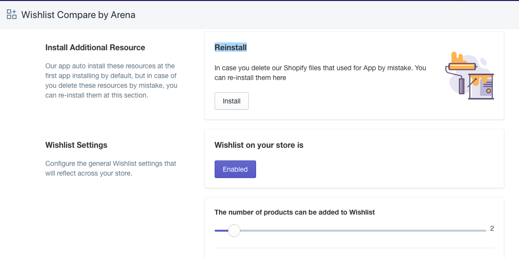 - Go to Apps > Arena Wishlist Compare or visit https://shopify.com/admin/apps/arena-wishlist-compare-install/